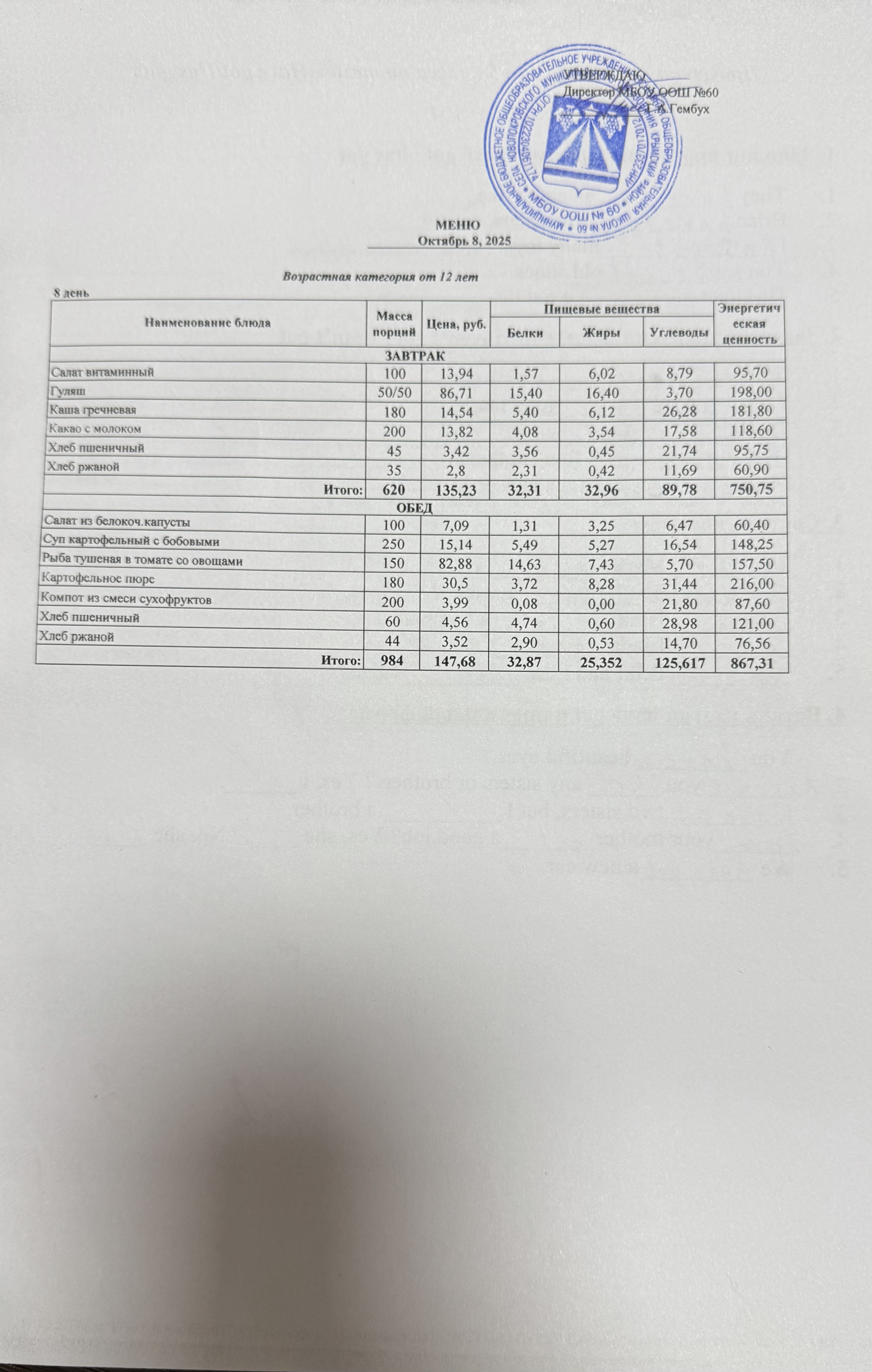 Примерное цикличное 10-дневное меню возрастной категории 12 лет и старше