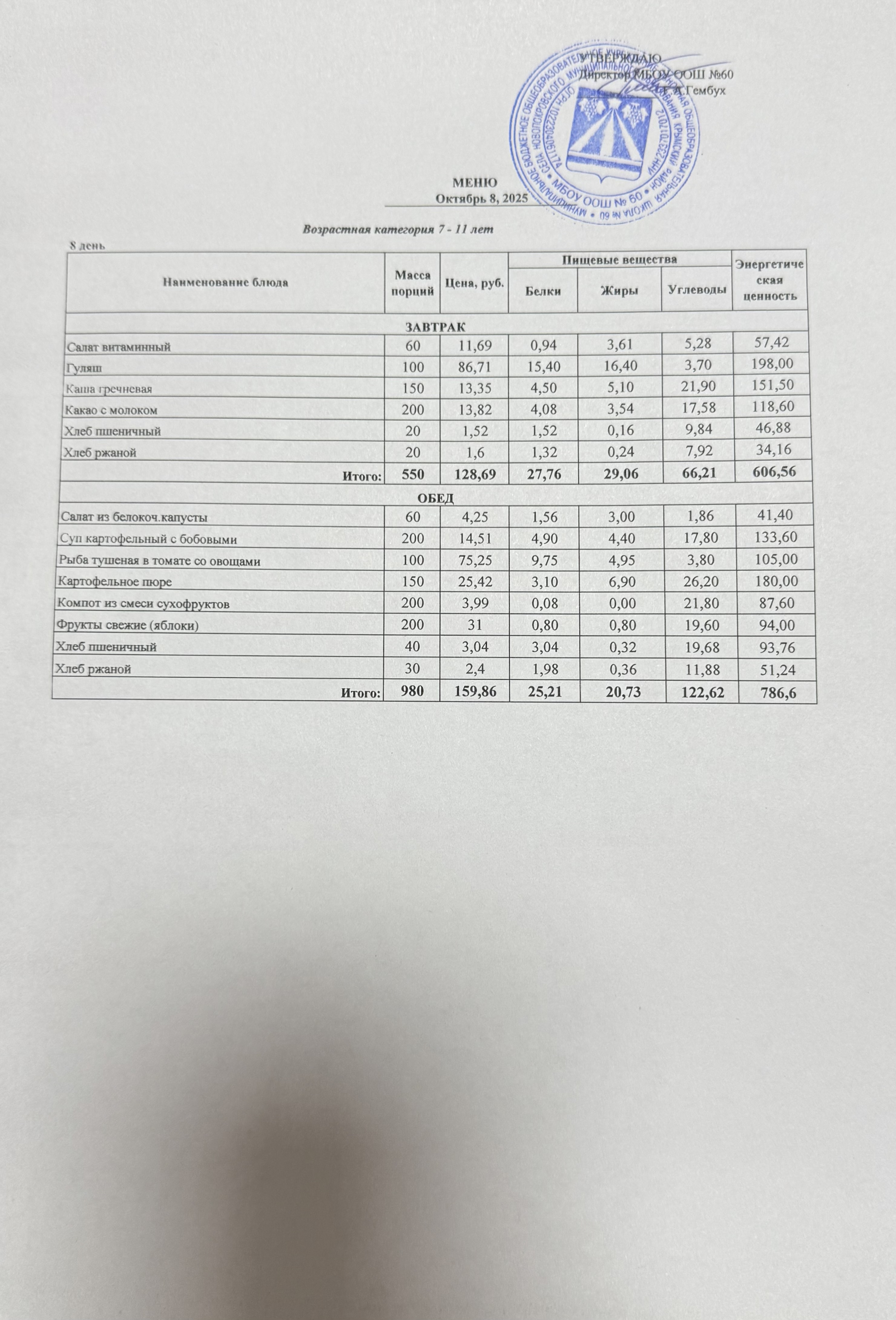 Примерное цикличное 10-дневное меню возрастной категории 7-11 лет